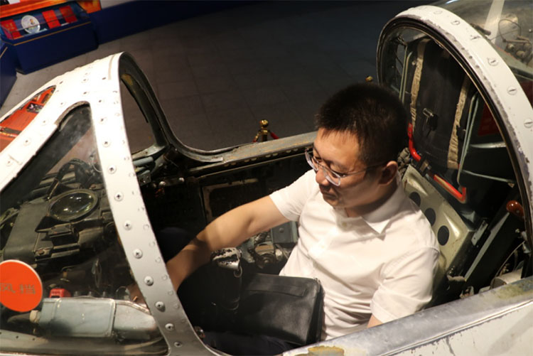 黃總在殲 6 型飛機(jī)座艙內(nèi)體驗(yàn)殲擊機(jī)飛行員的工作環(huán)境